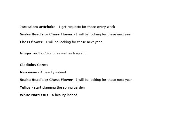 What makes all of the plants similar is their ability to store energy for the winter. As we discussed this spring, the more energy saved by the bulb, and now we know corm, tuber and rhizome, the more color, flowers and fruit we will get in the spring. For all of these plants: leave the green leaves intact as long as possible. With the weather turning the leaves will start to die back. For those plants hardy to your zone, once the foliage is dead, cut it back and leave it. The plant will comeback in the spring.