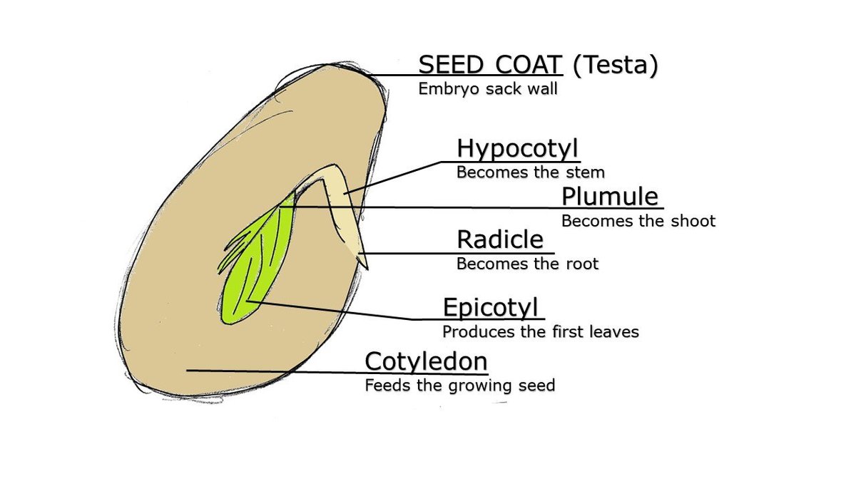 Testa or Seed coat: This outer coat protects the seed from the dangers of insects, bacteria and fungi. Along the seem of the seed call the hilum, we find the micropyle, which allowed fertilization of the seed and later allows water to the embryo starting germination process (we might think of this as a belly button).
